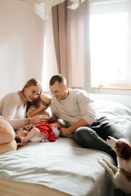 Pierwszą sesję dla tej rodzinki robiłam kiedy byli tylko we dwoje chociaż Leoś był już w brzuszku 🧡 później we trójkę..a teraz we czwórkę i to w dodatku w towarzystwie uroczego Gapcia 🐶🥰 Takie spotkania w Waszym domowym zaciszu mają swój wyjątkowy klimat. Nie wchodzę do Was od razu z aparatem, tylko na spokojnie chwilę porozmawiamy, pośmiejemy się. W tym przypadku mogłam jeszcze obejrzeć całą kolekcję książek Leosia 😄 aż w końcu wyciągam aparaty i robię zdjęcia Was, dla Was..tacy jacy jesteście 🧡